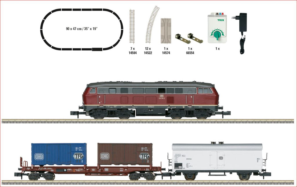 Minitrrix T11146 11146 N Startset Freight Train With Class 216 Diesel Engine, 2 Freight Cars, 900x470 mm, 35”x19“, Ep IV DB