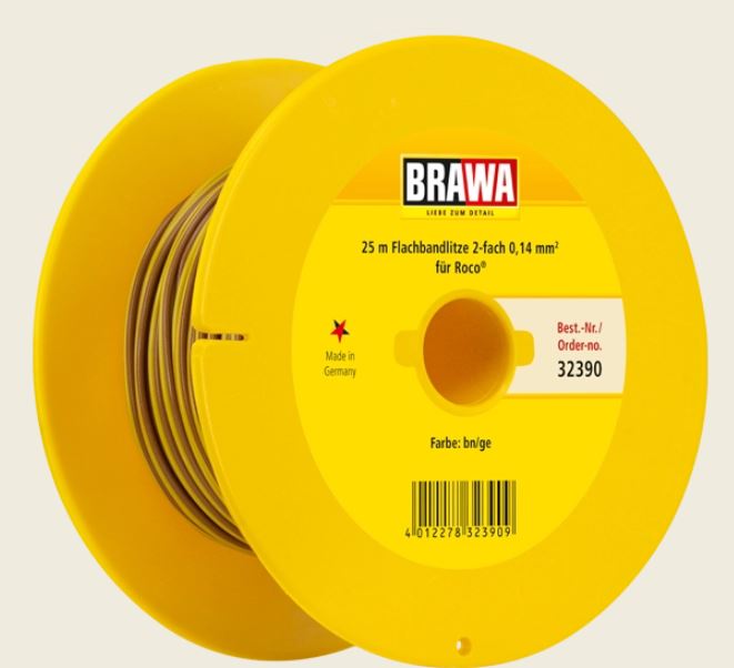 Brawa 32390 32390 Wire 0,14mm², Double-Core, PVC Isolation, 3A max, Cu-Conductor 2x18x0.1mm, 25m Drum, for Roco, Brown/Yellow